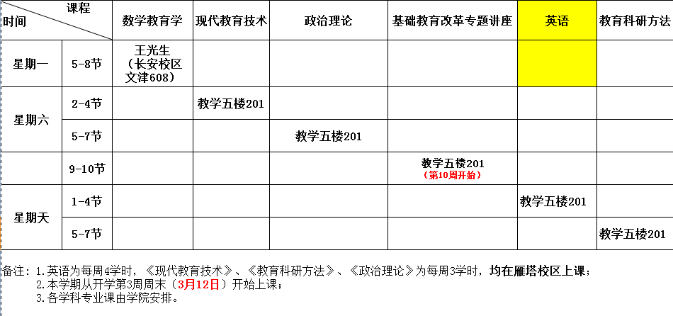 2015级在职联考教育硕士春季学期课表