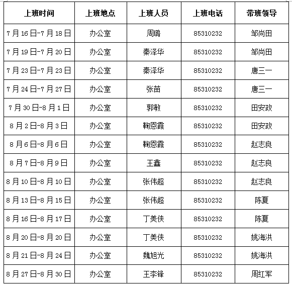 注意事项:1、按时上下班;2、保持办公场所干净整洁;3、注意安全和防火,每天定时巡查公司办公场所;4、做好假期信件的收发工作,每周一、周四取信件;5、每周五给花浇水一次;6、值班结束时须做好办公室钥匙的交接工作;7、遇紧急突发情况,及时向相关领导汇报。