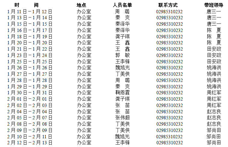 上班时间:上午08:00-12:00;下午14:30-17:30 办公电话:85310232;公司总值班电话:85310005;报警电话:85310110;急救电话:85310120—8120 注意事项:1、按时上下班;2、保持办公场所干净整洁;3、注意安全和防火,每天定时巡查公司办公场所;4、做好假期信件的收发工作,每周一、周四取信件;5、每周五给花浇水一次;6、值班结束时须做好办公室钥匙的交接工作;7、遇紧急突发情况,及时向相关领导汇报。