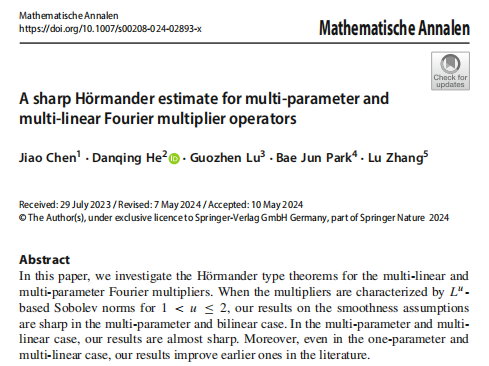 多参数算子有界性理论是调和分析中重要且前沿的研究方向之一。多参数调和分析的研究相较经典的单参数问题有本质的区别与困难。张璐教授的调和分析团队在Mathematische Annalen上发表了题为“A sharp Hörmander estimate for multi-parameter and multi-linear Fourier multiplier operators”(最佳光滑指标下多参数多线性傅立叶乘子的Hörmander型估计)的研究论文,全文共63页。论文研究了多参数背景下,多线性Hörmander型Fourier乘子的有界性及相应的乘子函数需满足的最佳光滑指标。首次在乘子函数满足几乎最佳光滑指标的条件下,较为完整地建立了多参数条件下多线性Hörmander型傅里叶乘子的Lp有界性理论。