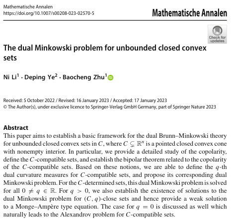 朱保成教授的几何学团队在Mathematische Annalen上发表了题为“The dual Minkowski problem for unbounded closed convex sets”(无界闭凸集的对偶Minkowski问题)的研究论文,全文共39页。该文主要建立了具有非空内点的闭凸点锥中的无界闭凸集的对偶Brunn-Minkowski理论的基本框架,引入了关于C-兼容集的q-阶对偶曲率测度,并提出相应的对偶Minkowski问题。论文还研究了与对偶Minkowski问题相关的Monge-Ampère方程,并讨论了其解的存在性。这篇论文为凸几何领域提供了新的研究视角,对理解无界凸体的几何和拓扑性质具有重要意义。
