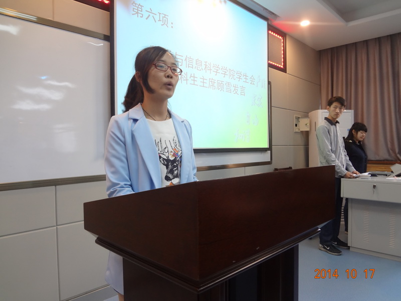 会上,公司分团委书记邹尚田宣读了新一届研究生会、员工会成员名单。2013级本科生冯芒同学带领全体研究生会、员工会成员进行了宣誓。新一届研究生主席陈士宁发言,并提出了对今后工作的设想:第一,完善制度建设,强化内部管理,在执行中探索,在实践中完善,在总结中提高;第二,打造精品活动,彰显研会特色,营造积极健康向上的校园文化氛围;第三,运用时代元素,服务广大同学,积极打造服务同学的沟通“微”平台。