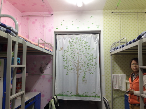 从“陋室铭”的别出心裁,到申报书的创新设计,再到桌上的摆放的小盆景,同学们的宿舍处处都让评委们眼前一亮。其中,陋室铭为“风之谷”的宿舍成员采用各种颜色的手工风车以及蓝天白云壁纸装饰寝室,并介绍了她们的装扮主题是像风一样自由。而采用毛地毯、茶几、木柜等家居用品装饰寝室的“谨行阁”展现了家的温馨。此外,“荷馨怡小清新”的照片墙,“婵媛茹梦”使用废弃光碟拼成的墙画,“悠然居”的爱心墙,以及各式的挂帘、风铃、同学们为自己装饰的温馨小床等,充分体现了同学们的创造力、想象力及动手能力。