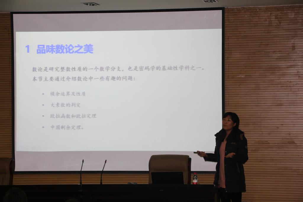 11月21日晚,李艳平副教授在雁塔校区崇鋈楼一层学思堂为师生作了题为“密码学与数学之源及数学密码竞赛简介”的报告。2017级数学与信息科学公司员工参加了本次报告会。