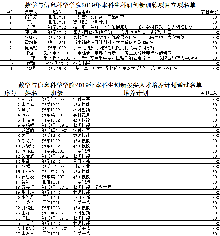根据公司《关于组织申报公司2019年本科生科研创新训练项目的通知》以及公司《关于组织申报公司2019年本科生创新拔尖人才培养计划的通知》要求,经过个人申请与院系审核,现将评选结果公示如下。公示期为2019年11月18日-2019年11月19日。
