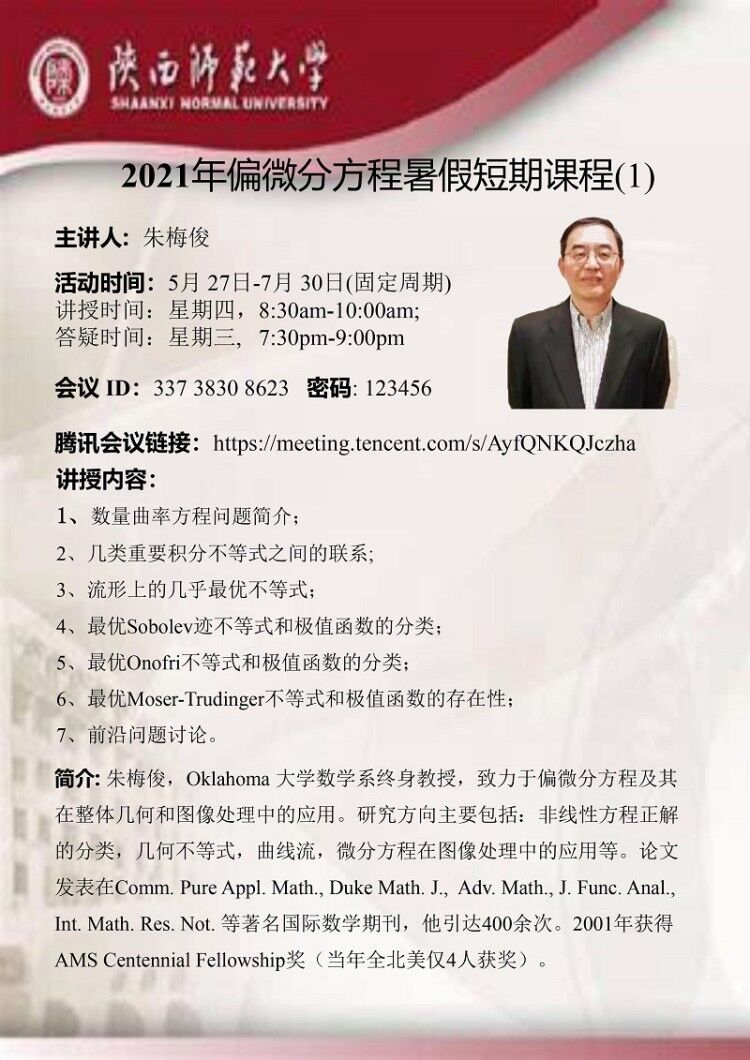 2021年偏微分方程暑假短期课程